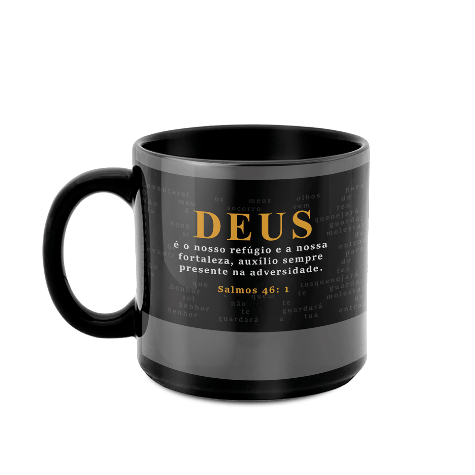 CANECA 330ML PRETA DEUS É O NOSSO REFUGIO