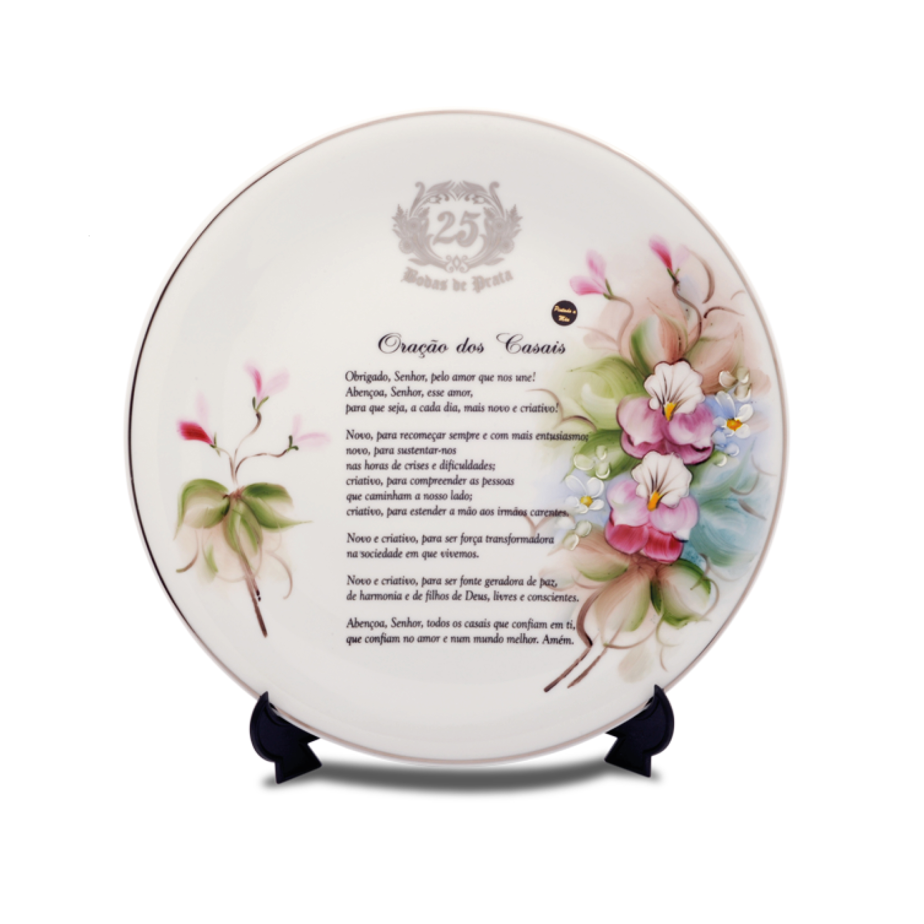 PRATO GRANDE FLOWER ORAÇÃO DOS CASAIS BODAS DE PRATA (ACOMPANHA SUPORTE)