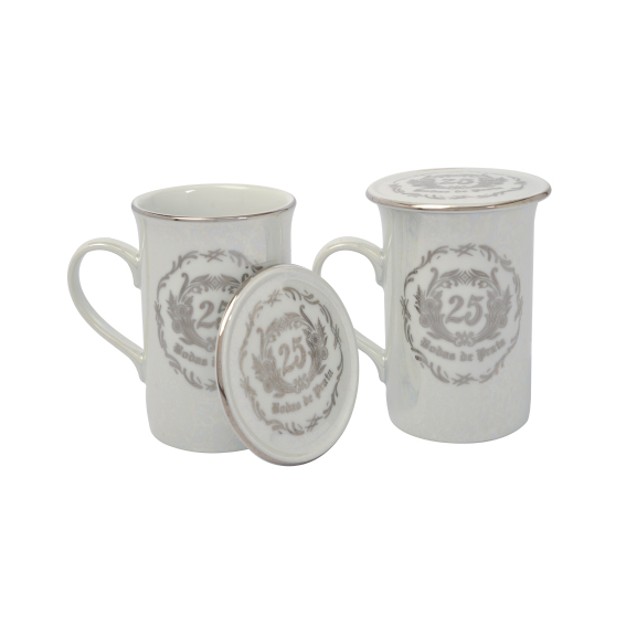 CANECA PORCELANA 240ML COM TAMPA BODAS DE PRATA (2 PEÇAS)
